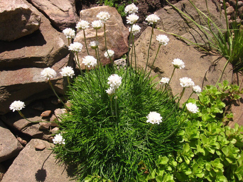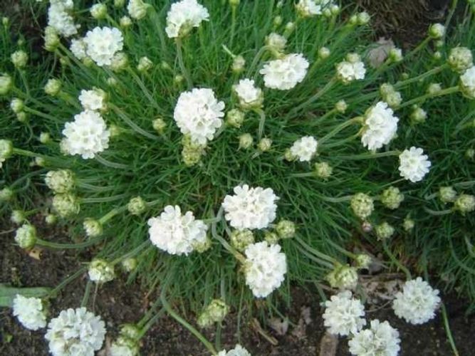 Цветки белые в головчатых соцветиях, окруженных сухими, перепончатыми прицветниками создают такое изобилие, что полностью закрывают зеленые розетки. Цветоносы 5 - 6 см высотой. Цветет очень обильно в конце весны — начале лета (в мае-июне), в течение 30 дней. Получается настоящий цветочный ковер. Если срезать цветоносы, то армерия зацветет в августе, но цвести она будет единичными цветками. Но аккуратные круглые куртины армерии хороши и без цветения.