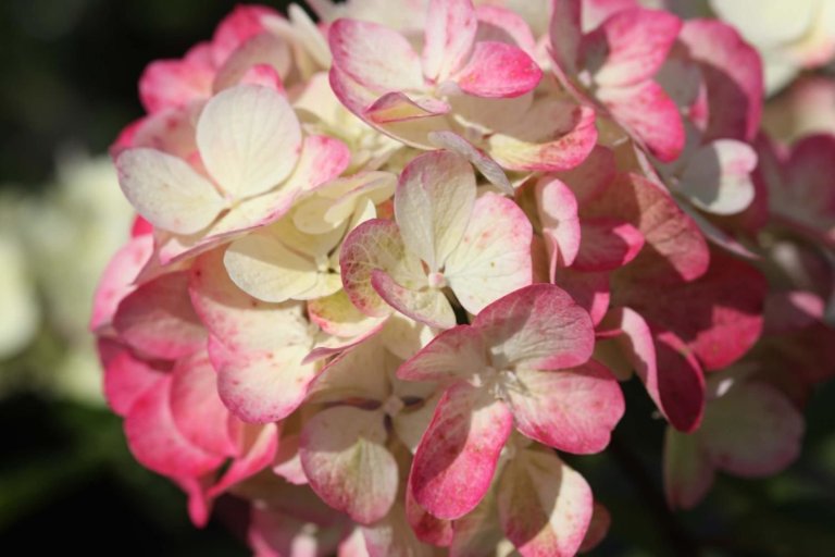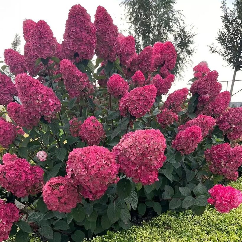 Плотное соцветие состоит из очень близко расположенных друг к другу крупных стерильных цветков, которые раскрываются белыми, центр цветка, венчает розовая бусинка и чуть позже появляется розовая каемочка, так начинает окрашиваться этот сорт. Затем соцветия розовеют и краснеют, приобретая яркие рубиновые тона. Цветущий куст очень наряден из-за разнообразной окраски многочисленных соцветий, расцветающих в разное время. Этот калейдоскоп красок продолжается до поздней осени, даря вам незабываемое зрелище. Аромат у цветов легкий и ненавязчивый, привлекающий в сад пчел и бабочек. Период цветения. VII-IX