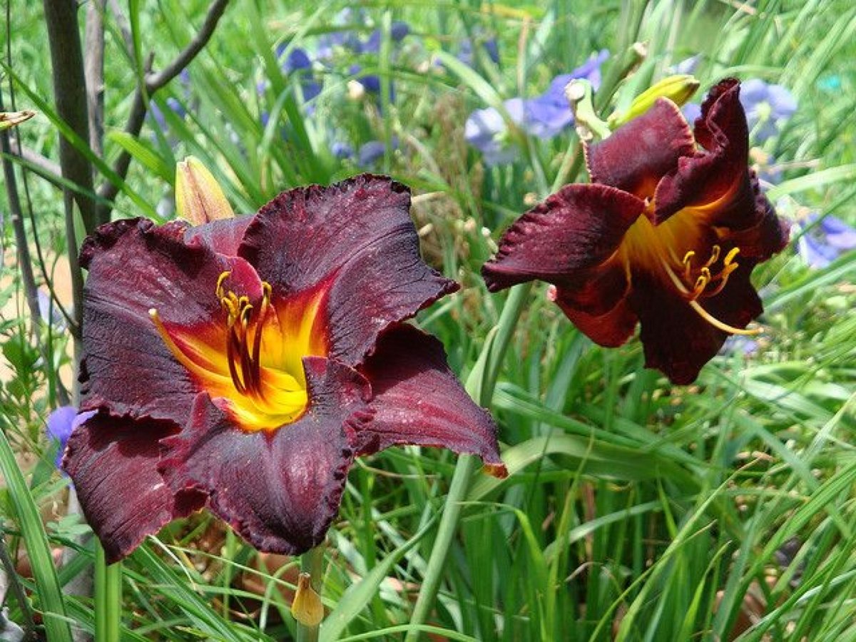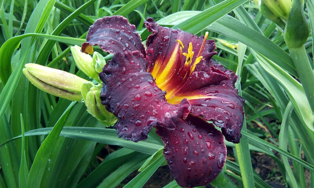 Полувечнозелёный гибридный лилейник Блэк Стокингс (Black Stockings) отличается тёмными крупными бутонами и обильным цветением