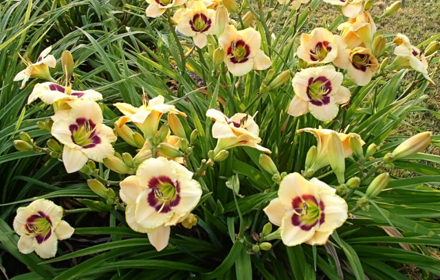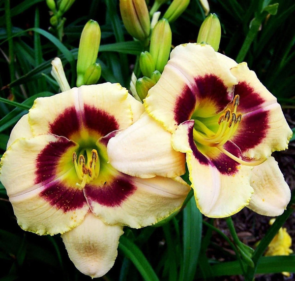 Роскошное многолетние растение, которое способно украсить любой сад. Светло кремово- желтый, с заметной темно желтой каймой по краю лепестков и пурпурно-сливовым глазком в горле. Красиво гофрирован и очень, очень обильно цветущий сорт. Диаметр цветка – 11 см. Взрослый лилейник может принести за сезон более 30 цветоносов. На каждом из них распускается до 20-25 цветков. Как правило, они живут всего несколько дней, но на них постоянно распускаются новые соцветия, создавая тем самым эффект обильного и непрерывного цветения на протяжении всего июля и августа, иногда даже большего периода. Высота – 50-60 см.