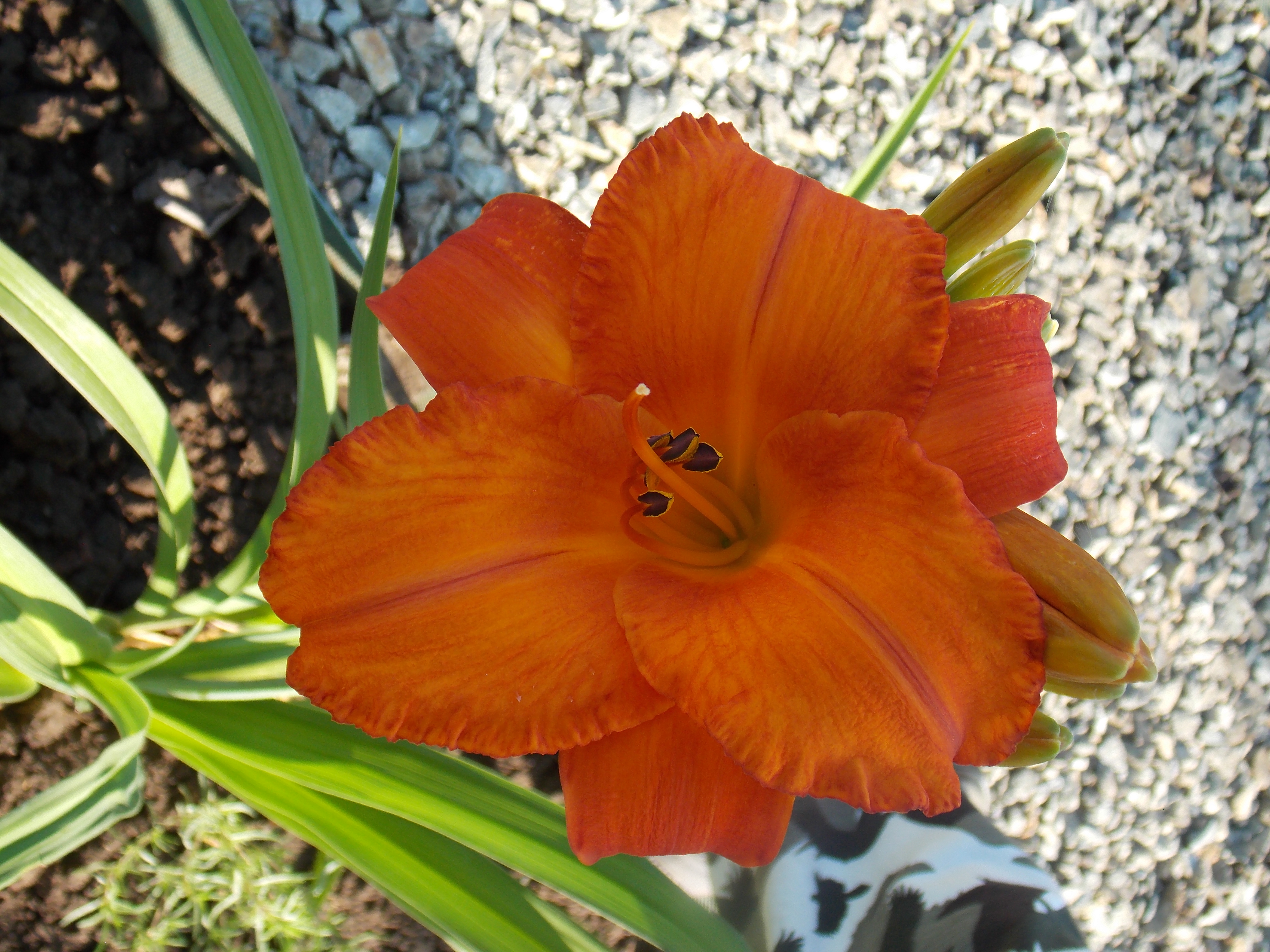 Спящий, тетраплоид, тип цветения дневной. Цветет июнь-июль. Цветки расположены на длинных толстых цветоносах и возвышаются над листвой растения. Высота цветоноса – до 80 сантиметров. Цветок лилейника имеет яркий, насыщенный и глубокий оранжевый цвет. На лепестках есть скромные узоры в виде красных полосок. Края лепестков волнистые, это придает цветку пышности и создает в сочетании с цветом яркий, запоминающийся образ.