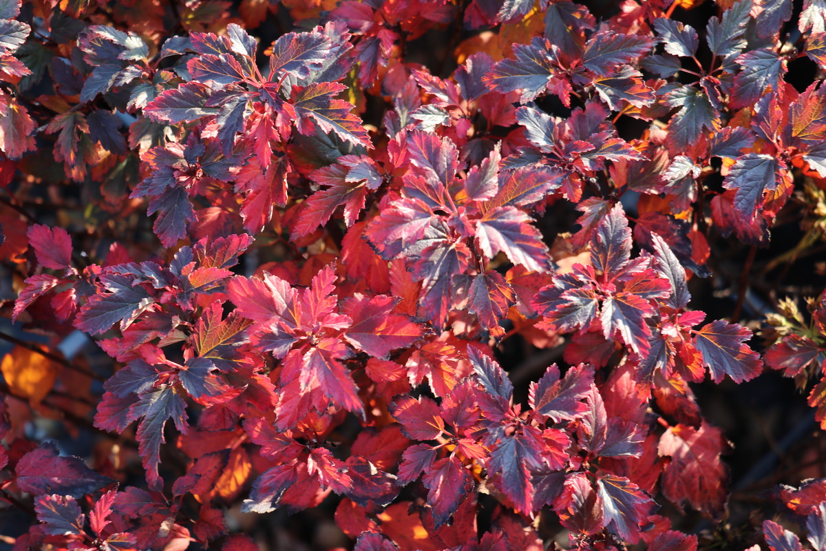 Листья декоративные, небольшие, лопастные. Летом у них более светлый, зеленый оттенок, а с приходом осени кустарник меняет цвет на темно-красный и бронзово-бордовый. С наступлением холодов листья у растения становятся алого огненного оттенка.