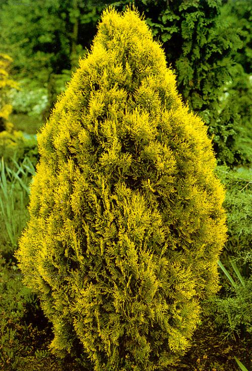 Вечнозелёный конусовидный кустарник, с очень густо-разветвлёнными, вертикальными ветвями, очень декоративными, слегка закрученными. Хвоя чешуевидная, нежная, глянцевая, густая, золотистой окраски с приятным хвойным ароматом. Молодая хвоя яркая, золотисто-желтая, зимой бронзовая. Наиболее яркая окраска получается на солнечных местах, в тени она становится зеленее. Взрослое растение достигает максимальной высоты около 3 м и 1,5 м в диаметре. Плотный конус с густыми вертикально-расположенными ветками, медленнорастущий, каждый год прибавляет 10см в высоту и 5см в диаметре. Кора в молодом возрасте красно-бурого цвета позже становится серо-коричневой. Корень поверхностный, компактный. Плоды круглые коричневые шишки около 1см в диаметре.